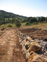 Given this bounty, our enthusiasm for bush rock uses knows no bounds. This week, we started building the "Great Wall of Carool" - an 80 metre retaining wall. Apart from stopping erosion on the hill (always handy when you are building a new house above) it means that we can now finally surface the road we had built last year..... which of course was washed out from the 6 months of rain that started immediately the day after it was completed.